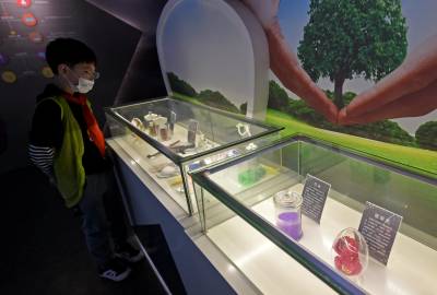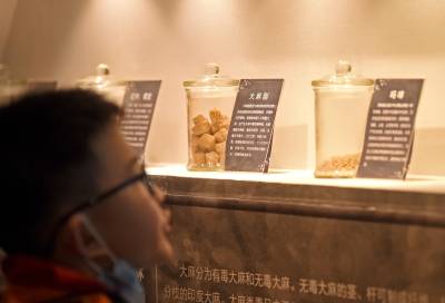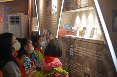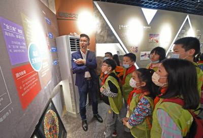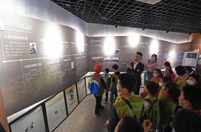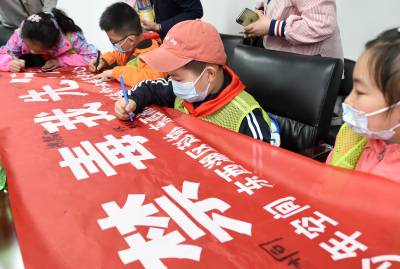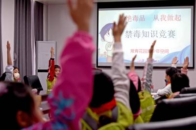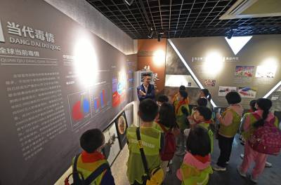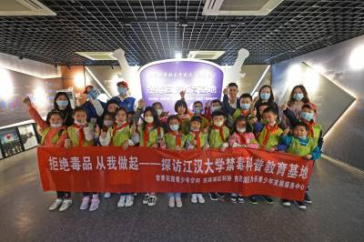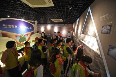 2021年4月17日,在武汉市江汉大学生物医学研究院禁毒宣传教育基地内,同学们在教育基地老师的带领下参观学习禁毒知识,并在横幅上签名宣誓远离毒品。当日,武汉市东西湖区常青花园青少年空间开展“拒绝毒品从我做起”活动,带领20名青少年走进江汉大学武汉生物医学研究院禁毒科普教育基地,通过参观让青少年了解禁毒历史、毒品的危害,增强自我保护意识,锻炼识毒、拒毒、防毒的能力,远离毒品。(湖北日报全媒记者 倪娜 通讯员 韦芳 摄)