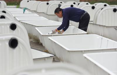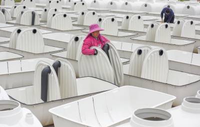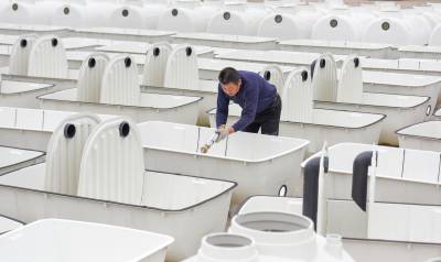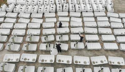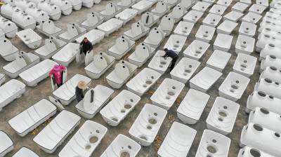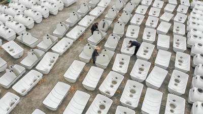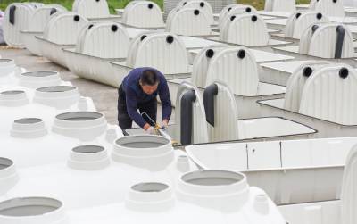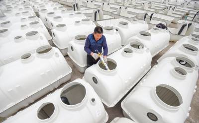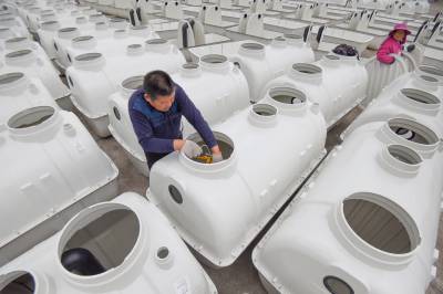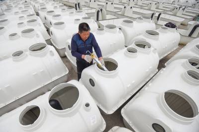 2021年4月19日,工人在湖北省荆州市荆州区弥市镇组装玻璃钢模压化粪池。