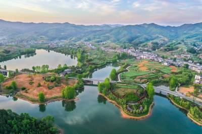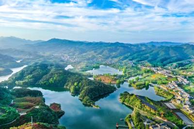 2021年4月18日,竹溪县龙湖国家湿地公园一湖碧水被葱翠的山脉、田园和蓝天白云相映得如诗似画,美不胜收。