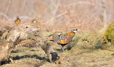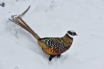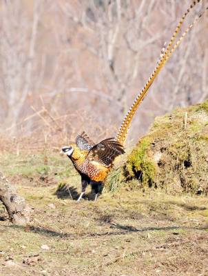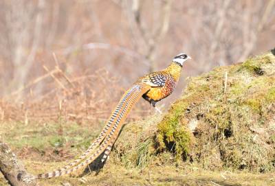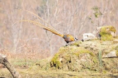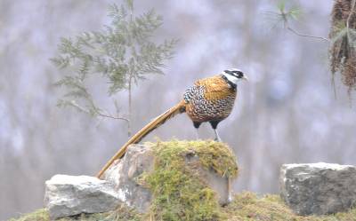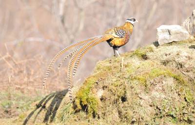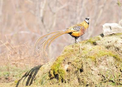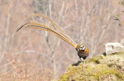 拉丁学名:Syrmaticus reevesii。为鸡形目,雉科。中国特产珍禽,国家一级保护动物。体重1425-1736克,体长140-197厘米,喜在常绿针阔混交林和落叶阔叶乔木林中栖息、隐蔽和觅食,取食鳞翅目的幼虫、虫卵。其优雅的体形、艳丽独特的羽色,极具观赏价值。长尾雉尾羽称为“雉翎”。