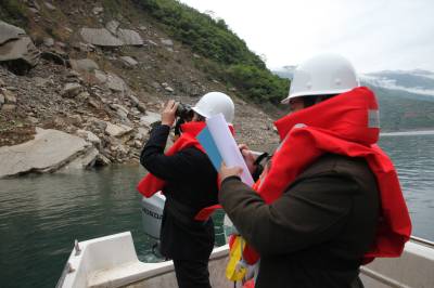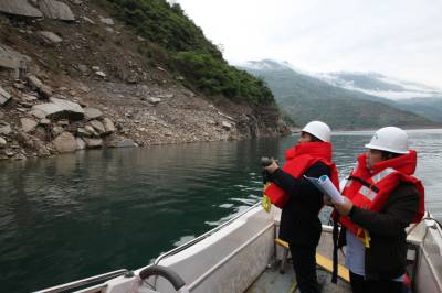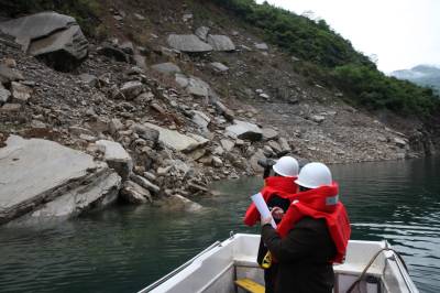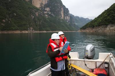 4月20日,在金果坪乡桃符口地质灾害点,该乡地质灾害巡查专班正在乘船观察地质灾害点的变化情况。