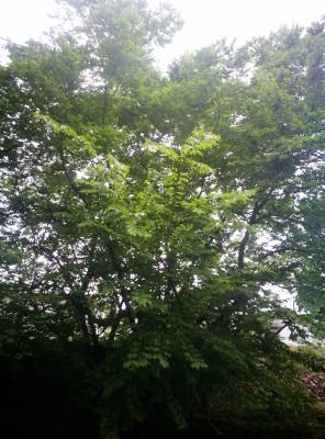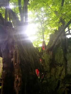 丹江口六里坪镇蒿口村、马家岗村交界处一排民居后面,有一颗树龄达到1100余年的青檀树,古青檀扎根于一个直径约9米、高度3.5米的天井里。天井内留有一条仅容一人通过的台阶,顺着台阶走到底部,可以清晰地看到青檀的根部全部在天井内,一边似饱经风霜的虬龙翻旋盘卧,一边旁生的新枝渐渐有长成大树。古树像一把巨伞一样,从天井冒出来,向四周散开,枝繁叶茂,葱郁茂密,面积足有150平方米,高度超出附近3层高的居民楼。