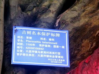 青檀树高寿,是村民们眼中的“吉祥树”,居民爱树护树成为自觉行动,人树和谐共处,共生共荣,有人还在树上悬挂一块红布祈求平安长寿。2021年4月1日,当地明确了蒿口村书记王德荣、副主任张涛为该树的安全直接责任人和安全管理人,丹江口市政府2019年12悬挂在古树上的“古树名木保护标牌”显示,这棵古树为青檀,树龄1100年,保护级别为“国家一级”。
