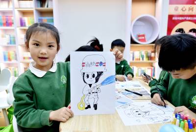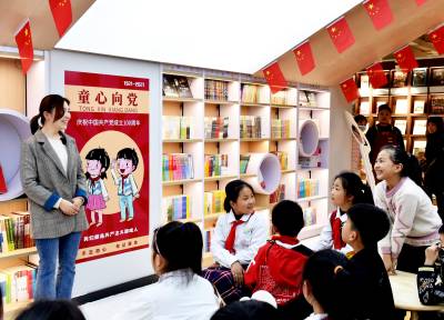 2021年4月22日,湖北省襄阳市南漳县跨世纪幼儿园的孩子们正在绘画自己心中的英雄。当日该县党史学习教育系列主题教育实践活动在该县党史学习教育基地——县新华书店正式启动,为建党100周年献礼。 在书店一楼大厅打造学习教育展示专区:成列布置“庆祝中国共产党成立100周年”党史学习教育系列图书以及各种红色主题图书和相关多元产品,面向广大党员干部群众开展红色经典图书联展和读书活动。尤其在二楼少儿区域打造少年儿童党史绘画专区:每周末定期举行“慧阅读”“创手工”“书法”等少儿活动;邀请儿童及家长共同参与亲子互动,同读经典党史故事,同讲英雄事迹,同画“我心目中的英雄”,同唱红色少儿歌曲等活动;举办“党史故事朗读比赛”“英雄人物绘画比赛”“红色儿歌演唱比赛”等,培养青少年儿童爱党、爱国、爱社会主义的思想感情。