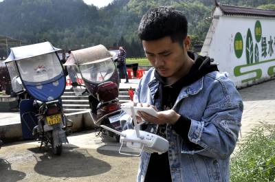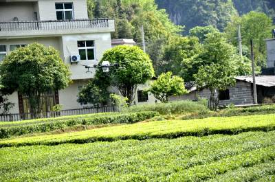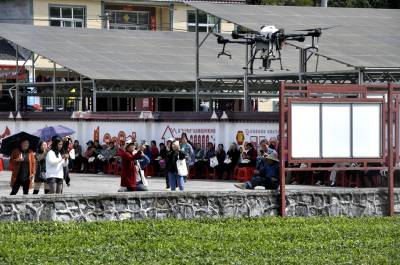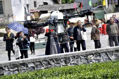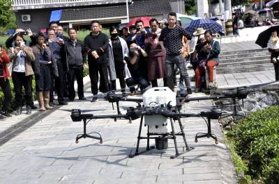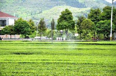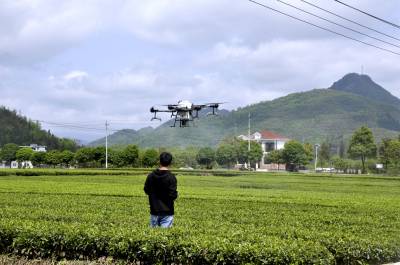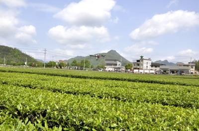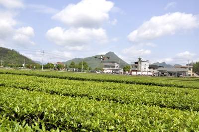 在该村的茶园里,笔者见到了正在操作无人机喷洒农药的技术人员。在他们的操作下,无人机自如灵活地超低空飞行,不时变换着高度、速度、及方向,将药物均匀地喷洒在茶叶叶面上。