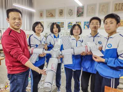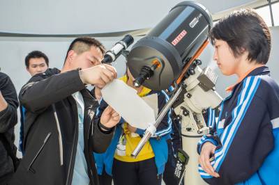 老师指导学生通过天文望远镜观看月球上的陨石坑、环形山、土星环、太阳黑子。老师对照模型,以人体比喻卫星构造: 向学生普及中国航天日的由来。五大航天(神舟、嫦娥、北斗、天问、天宫)计划的历程等航天科普知识。通过对长征系列火箭和中国各类卫星的发展历程和构造原理进行互动问答。航天爱好学生平时乐于以光洁纸制作“天宫”模型练习、讨论提高航天知识,弘扬新时代的航天精神,培养学生“空天报国”情怀。
