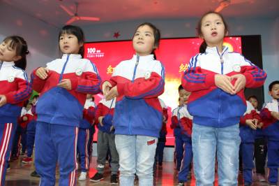 “红星闪闪放光彩,红星灿灿暖胸怀,跟着毛主席,跟着党,闪闪的红星传万代……”震撼人心的歌声久久回荡在幼儿园上空,深深印在孩子们的心中!