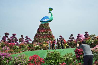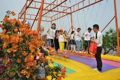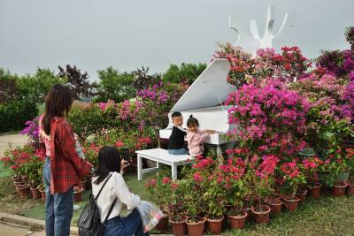 5月5日,在宜都市枝城镇全心畈村,游人在三角梅花展上赏花游玩。“三角梅花展”由宜昌国坤旅行公司与全心畈村联合举办,5月1日开园迎客,五一小长假共接待游客2万多人。三角梅装点的10米高的大孔雀、2米多高的鸵鸟花钵、3米多高的柱状三角梅等景点深受游人喜爱。此次三角梅花展将持续至6月中旬。