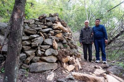 今年清明节前的4月3日,周建林在为父亲上坟时下定决心,一定要在建党100周年到来之前找到爷爷牺牲忠骨,接烈士爷爷回家。说干就干,4月4日,周建林就开车来到高庙东浪河当年爷爷周吉富他们翻身队与土匪的激战地,先后走访了100多户村民,向75岁以上的村民打听74年前的那场战斗经过。功夫不负有心人,周建林终于得到确切信息,当年的那场战斗有8名翻身队员被土匪押往白桑关方向,听说被活埋在红薯窖里。4月5日下午,周建林找到白桑关镇退伍军人事务管理所查找到线索后,一起驱车来到了白竹沟村4组,找到了78岁的刘荣贵老大爷,据老人介绍1964年清明节,当时刘荣贵只有20岁,白竹沟村当时叫建强大队,大队长叫尤大清,组织60多人来到活埋7人烈士的烟筒山南山腰红薯窖遗址,对红薯窖进行发掘确认,最终挖到了烈士遗骨后又回埋后,在红薯窖上用石头磊起一座大坟头。每一年村学校都会组织学生来此扫墓,讲翻身队烈士们牺牲事迹,文化大革命后这处烈士牺牲遗址慢慢的被人们淡忘了。