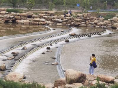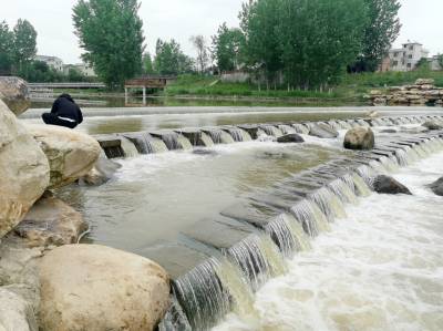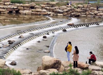 2021年5月5日,房县沙沟河红塔营盘段生态坝流水孱孱,洪水退潮后的河水逐渐露出水清如镜的“真面目”,图为游客在沿河两岸观水、赏景、休闲。