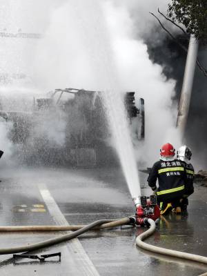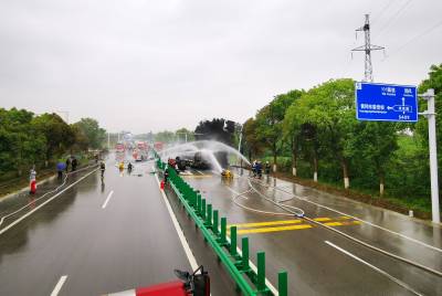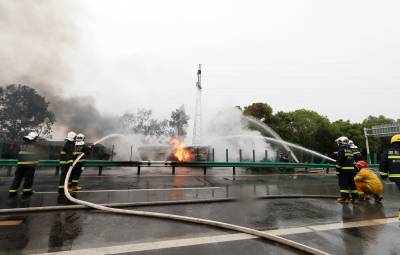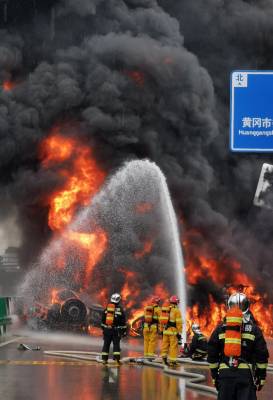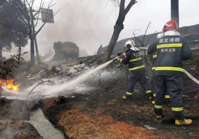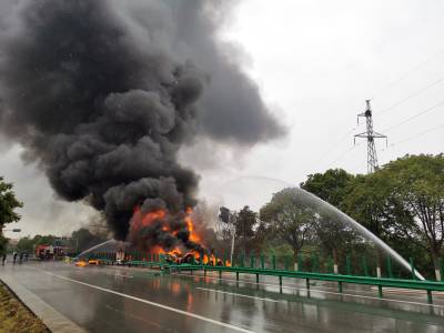5月6日下午2时23分,在湖北省黄冈市黄州区境内,一辆装有约20吨的汽油槽罐车沿江北一级公路由南向北行驶至求实路口附近,发生侧翻,导致汽油泄漏,随后起火燃烧,并引燃前方的一辆货车,现场浓烟滚滚。事故发生后,当地消防、应急、公安、医疗、路政、环保、电力、中石化等力量立即响应,到场处置。