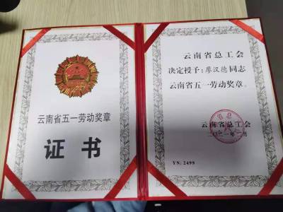 “五一”劳动节,湖北省巴东县水布垭镇水坡村廖汉德获得云南省总工会表彰并颁发省级劳动模范荣誉证书和奖章。