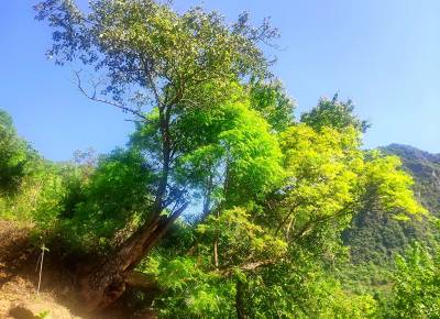 据现场勘察,这对“母子树”位于湖北堵河源国家级自然保护区境内,由两棵不同的树种组合而成,黄连木从梨树的树干基部穿过长出,形似母亲将孩子紧紧拥抱在怀中。“母亲”是一棵梨树,胸径70㎝,树龄在200年以上,主干断裂仅留有一侧枝,“孩子”则是一株黄连木,胸径38㎝,树龄约50年,两棵树相依相生,枝繁叶茂。