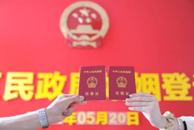 2021年5月20日,在湖北省十堰市茅箭区服务政务大厅,不少新人喜领结婚证。(视界网 章新俊 摄)