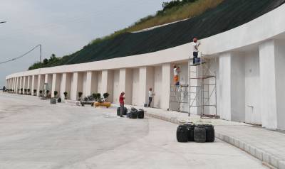 5月20日,巴东县神农新区清溪路接线(官渡口集镇连接道及管网)建设工地,工人师傅正在为抗滑桩挡土墙喷漆。