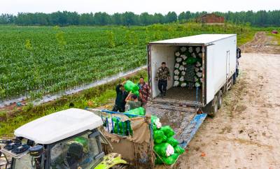 5月20日,湖北金润农业发展有限公司的嘉鱼县蔬菜种植基地嘉鱼平安洲1000亩包菜地,菜农们正在将包菜收割打包装冷链车,运往广州,日销售上百吨。眼下江水上涨很快,通往江洲路已被水淹,只有货车勉强过,为减少损失公司正在抓紧外销。