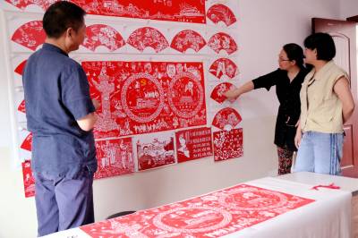 这幅剪纸作品长115厘米,宽56厘米。画面以100为主要元素,两个零中间剪出了“不忘初心、牢记使命”八个字。周围用60个惟妙惟肖的人物对党的部分重要历史事件进行了回顾,巧妙地将剪纸艺术与建党元素相融合,用剪纸作品致敬党的百年光辉历程,抒发了普通群众对党的衷心拥护和热爱,以此迎接党的百年华诞。视界网薛乐生 吕丽萍摄