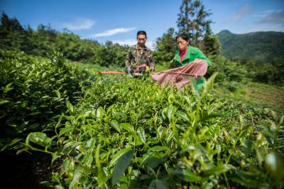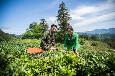 5月24日,竹山县深河乡双湾村茶农张道富和妻子杨佩华正在修剪茶园,并将修剪下来的“大脚板”夏茶卖给村里茶叶加工专业合作社(制作红茶)。张道富说,今年夏秋两季修剪下来的“脚板茶”,可额外增加收入2万多元。今年53岁的张道富是竹山县深河乡双湾村的茶农,也是该村靠茶致富的带头人。以前张道富外出打过工,也做过一些小生意。近年来,张道富决定从本地资源做起,专心做好茶叶生产加工。