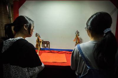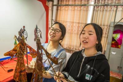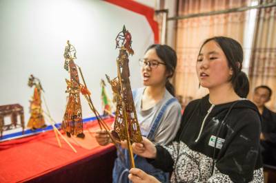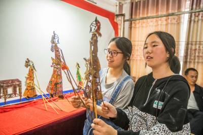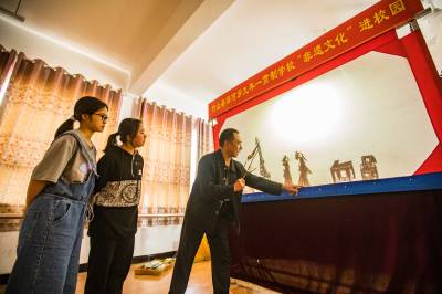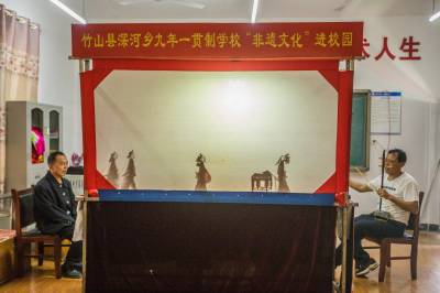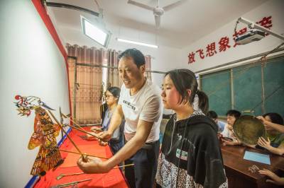 5月24日,在竹山县深河乡九年一贯制学校,学生在该乡非遗文化传承人李胜海、常开清二位艺人指导下学习堵河皮影戏唱腔、手技等表演艺术。