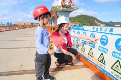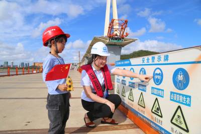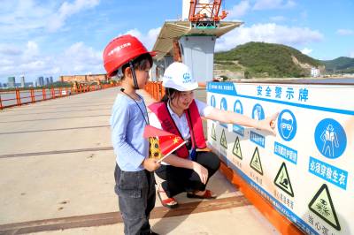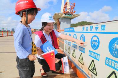 韩屹宁每年要到工地来探亲一次,在工地除了和爸爸妈妈在一起生活娱乐外,好多时间都和项目部员工胡馨月(志愿者)在一起玩,他们在一起很投缘,无话不讲。5月26日下午,胡馨月(志愿者)带着韩屹宁到工地看大桥、看大海,韩屹宁可高兴了。当他们在工地看到栈桥栏杆上挂的安全警示牌时,警示牌上的图案吸引了韩屹宁的好奇,胡馨月随口就告诉他“这是安全帽、防护服、防护手套、防护鞋.....”,以及这些安全图案的意思和作用,韩屹宁两眼目视安全图案,就像听故事一样的专注。