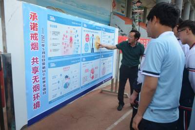 活动中,郧阳区疾控中心专家对全校师生进行烟草危害知识宣讲,郧阳区卫生健康局党组成员李萍做拒绝吸烟讲话,学生代表宣读“拒吸第一支烟,做不吸烟新一代”倡议书,学生在“拒吸第一支烟,做不吸烟新一代”条幅上签名,学生观看控烟知识展板和宣传资料。