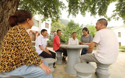 图:2021年6月1日,湖北省十堰市房县五台乡红场村移民在古村下畅谈幸福生活。