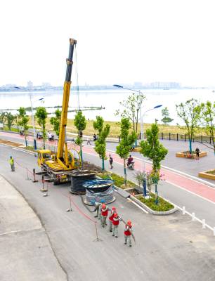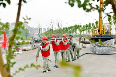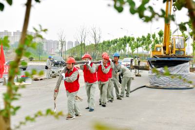 7月14日,在老河口市汉江沿岸,老河口市供电公司组织施工人员新建10千伏光59线光西线路沿江路支线4号环网柜,为全市防汛用电提供保障。图为该公司施工人员在敷设电缆。(丁建杰 郭峰)