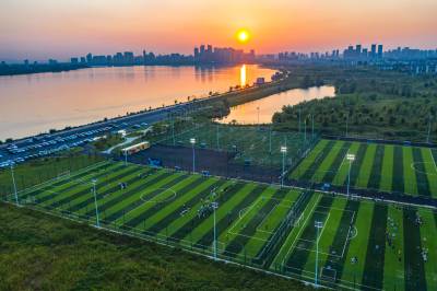 7月30日,襄阳汉江江畔,足球爱好者在鱼梁洲的智投足球公园里踢足球。