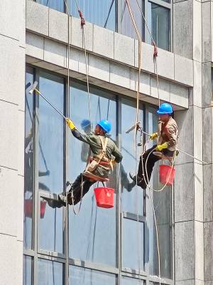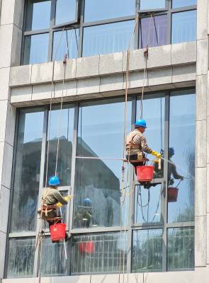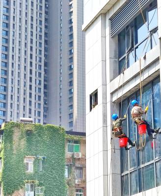 8月1日,武汉市江汉区天门墩菱角湖路,两名农民工蜘蛛人,在湖北省中西医结合医院即将投入使用的新医疗大楼“飞檐走壁”,冒着高温39℃以上的高温,汗流夹背清洗建筑物的外墙污垢痕迹,不仅美化了城市医院环境,而且起到了保护建筑物的作用,他们既是深受居民群众点赞的城市蜘蛛人,又是城市高楼大厦必不可少的美容师。