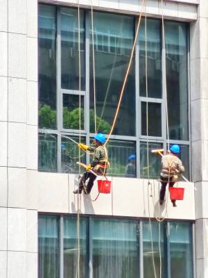 湖北武汉:盛夏时节蜘蛛人冒着高温 为新医疗大楼做外墙面保洁