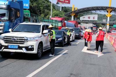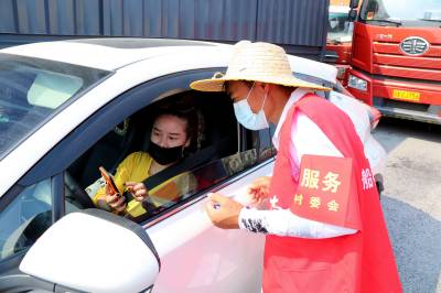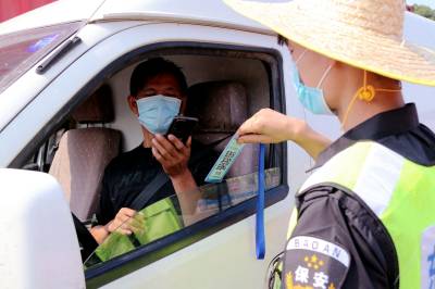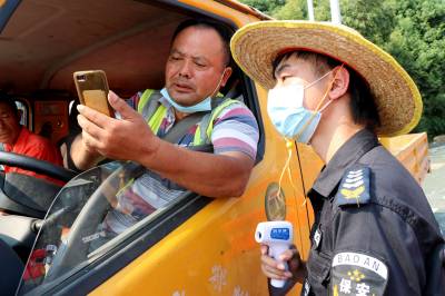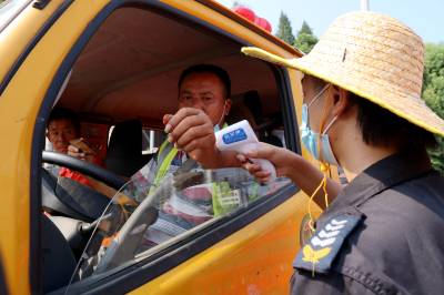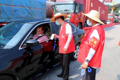 2021年8月4日,在十堰东高速出入口疫情防控卡口,疫情防控人员正对下高速进入十堰的车辆进行逐个检查登记,对过往车辆驾乘人员测量体温,查验出行码并进行登记。辖区社区(村)干部、保安、协警、志愿者等人员头顶烈日,实行全天24小时不间断值守,做到不漏一车、不漏一人,守好交通卡口疫情防线,保障全市人民群众生命安全和身体健康。视界网薛乐生摄