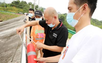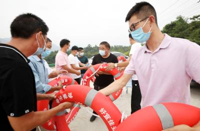 图二:2021年8月5日,湖北十堰市房县安华卫浴“生命至上”爱心公益在行动的爱心公益宣起人陈金龙在该县红塔镇七里沟水库捐赠救生圈。