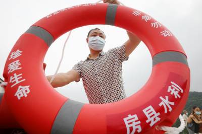 图一:2021年8月5日,湖北十堰市房县安华卫浴“生命至上”爱心公益在行动的爱心公益宣起人陈金龙在该县七里沟水库示范系防溺水救生圈方法。