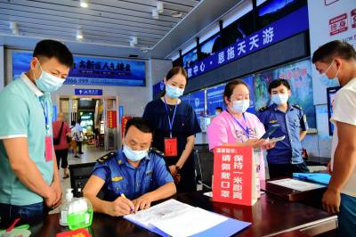 8月6日,在恩施旅游客运集散中心,恩施该市纪委监委干部正在开展监督检查,督促车站做好疫情防控要求宣传、佩戴口罩提示、进出站口体温检测。