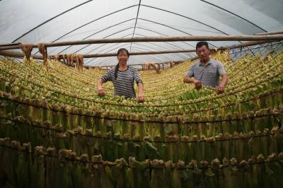 8月11日,巴东县金果坪乡泗井水村的烟农李发科夫妇正在保温保湿晾棚里晾制白肋烟.