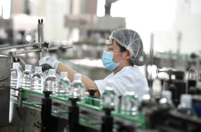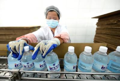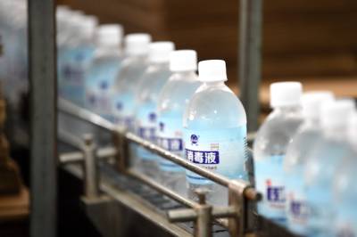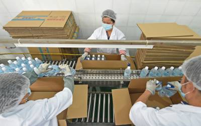 8月9日,在武汉市东西湖区武汉雪环医用消毒用品有限公司生产线上,工作人员正在对刚下线的产品进行打包。连日来,武汉市及省内各地对于医用消毒产品的需求增加,该公司全员在岗,生产车间保持一天工作15小时的生产状态加急生产,一天可生产12万余件消毒产品,其中包括医用酒精、84消毒水、碘伏以及其他免洗手凝胶等产品,供应武汉各大药店、医院等。(湖北日报全媒记者 倪娜 通讯员 徐一帆 徐卉婷 摄)