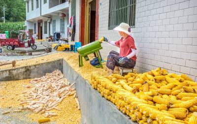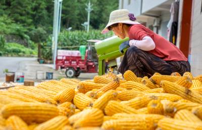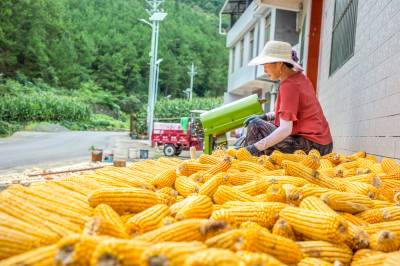 2021年8月18日,竹溪县蒋家堰镇六沟口村一组村民蒋青兰正在整理准备归仓喂养大肥猪的玉米。