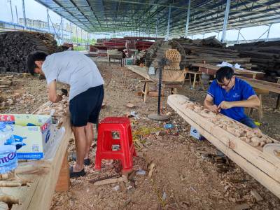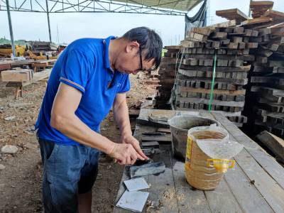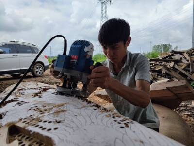 2021年8月18日,木雕非遗传承人纪庆华、纪建明在云梦县“祥云湾文旅景区”忙着进行木雕制作。
