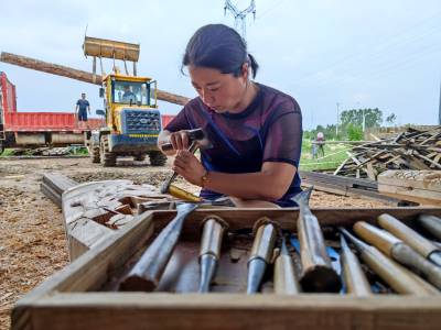 2021年8月18日,木雕工匠传承人程月焱、陈静在云梦县“祥云湾文旅景区”忙着进行木雕制作。
