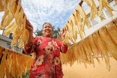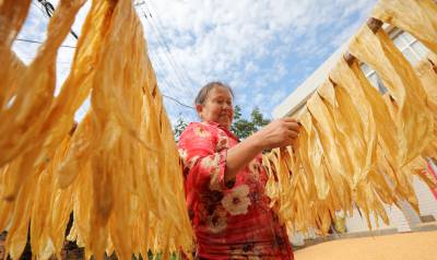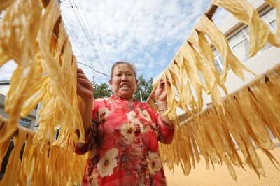 2021年9月2日,十堰市房县白鹤镇赤岩村农民邹正梅在晾晒手工豆油精。该县豆油精荣获国家地理标志产品,俏销日本、越南、韩国等国外市场,年均实现收入达15亿元,成为农民增收致富的主力产业。据史料记载,当地手工制作豆油精具有两千多年历史,曾经是唐朝庐陵王李显被贬房州(现今房县)时非常喜爱的一道美味佳肴。这个县豆油精为手工制作,豆香味纯正,富含有人体所需蛋白质,钙、钾等矿物质成分,被人们称之为“植物肉”。