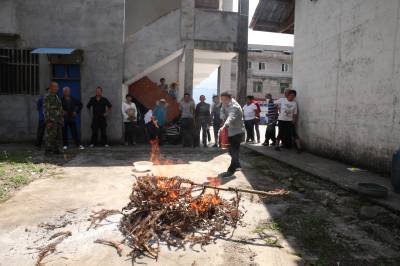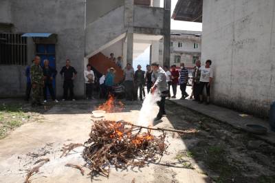 9月4日,巴东县金果坪乡应急办的工作人员正在该乡大房坪村7组院坝会上,手把手指导村民使用灭火器灭火。