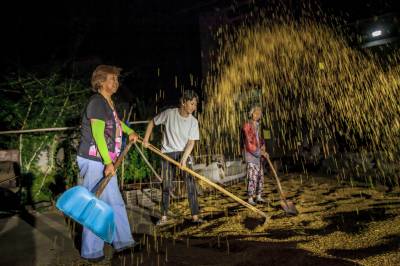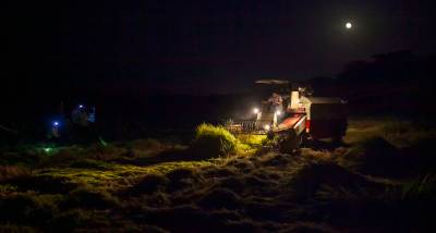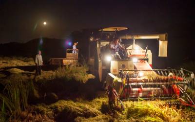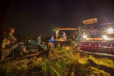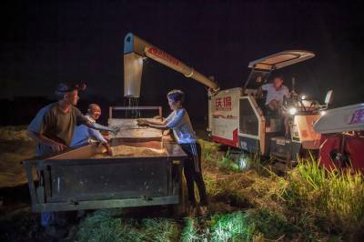 记者在孙桥镇看到,虽然已是深夜十点多了,八月十六的圆月还在天上高高挂着,还是有很多收割机工作在漆黑的稻田里,车灯在稻田里显得格外明亮刺眼,一台台手扶拖拉机穿梭在田间地头转运收割下来的稻谷。