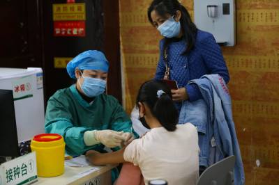 10月28日,在襄阳市中心医院南院区新冠疫苗接种点,学生在家长的陪护下接种疫苗。