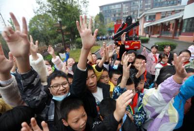 11月4日,在湖北省宜昌市五峰土家族自治县幸福小学,千余名师生同学消防知识。