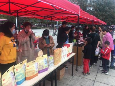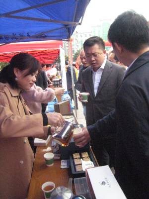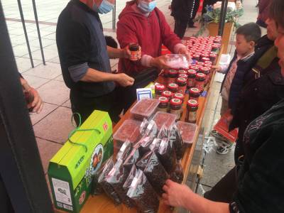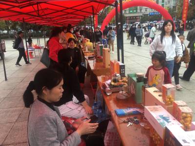 在外围两侧,则是12家农产品展示自己的特色产品,有鱼酱、豆豉、香脆饼、黄精片、茶叶、通山包坨、野生猕猴桃酒等地方土特产,市民或品尝或购买。