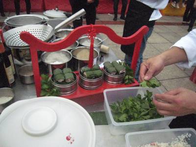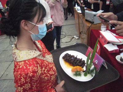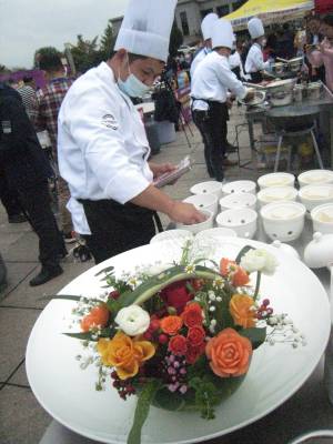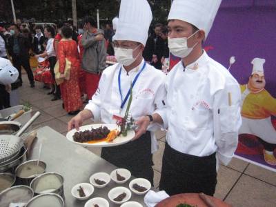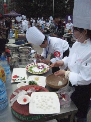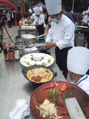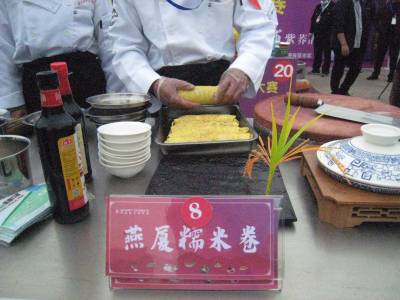 记者在现场看到,两排灶具家当一字儿摆开阵势,各位厨师有条不紊地忙碌着,挥洒自己的独门绝技,一阵阵诱人的香味氤氲飘荡。菜把肉、燕厦糯米卷、红尘妃子笑、百合腊香笋、原生态豆腐、吊锅三鲜、红烧肉、农家大碗锤肉、粽香排骨……48道大菜目不暇接,共有24家餐饮业的24位选手参赛。