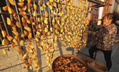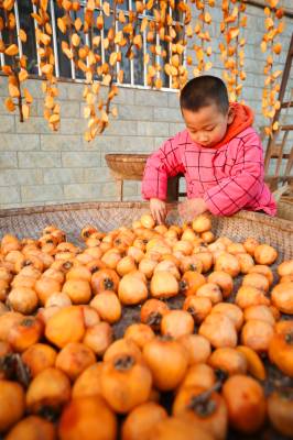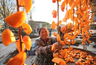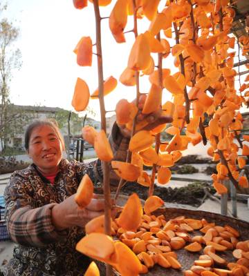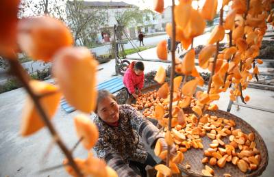 2021年11月9日,十堰市房县化龙堰镇长望村村民许世莲在家门前忙着晾晒柿子。初冬时节,房县柿子喜获丰收,村民抓紧时间制作柿子饼、柿子干。该县在水土保持小流域区绿植柿子、核桃、板粟等水保经果林60万亩进入盛果期,平均每年实现优质干鲜果收入达11亿元。水保经果林促进了村民增收致富,也对涵养水土改善生态、宜居环境发挥了推力作用。