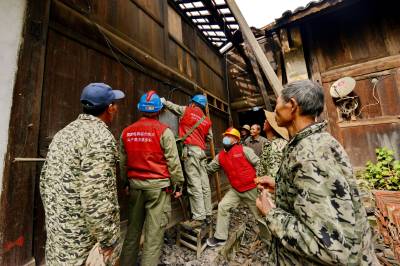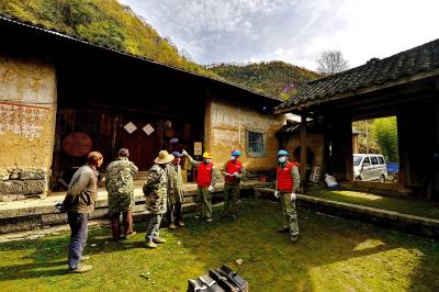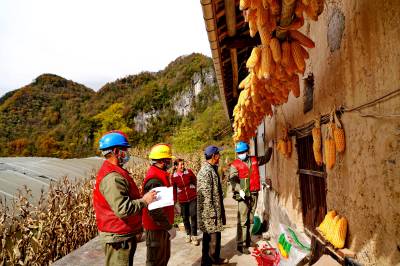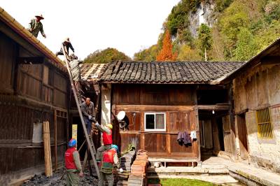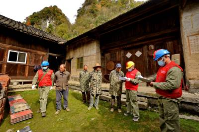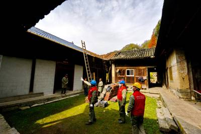 11月9日,在巴东县绿葱坡镇香家垭村三组,村民吴昌容正在整修老木质房,为老“四合天井屋”房顶添砖加瓦。一旁,国网巴东县供电公司3名党员服务队员正在帮助检查供电线路,帮助规划室内外线路改造。