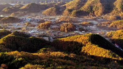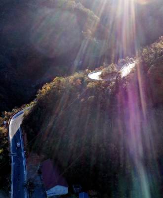 2021年11月9日清晨,我们站在湖北北省襄阳市南漳县板桥镇冯家湾村的官墒岭俯瞰大地,虽是冬日却满目秋意:清晨的薄雾在阳光的照射下似一缕白纱轻轻飘舞;座座金山像珍珠洒落玉盘;农家门前鎏金溢彩。赤橙黄绿青蓝紫,色把整个冬日的山乡装扮得五彩缤纷,美不胜收。 (视界网 熊明银 王小平 摄)