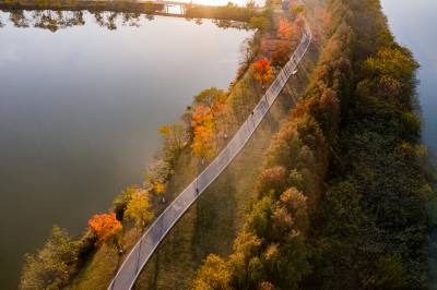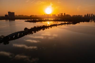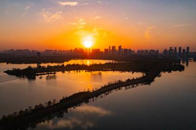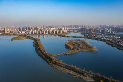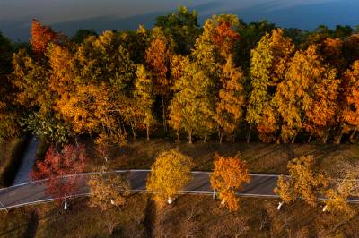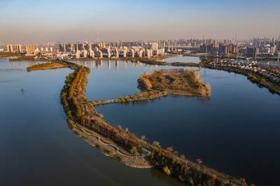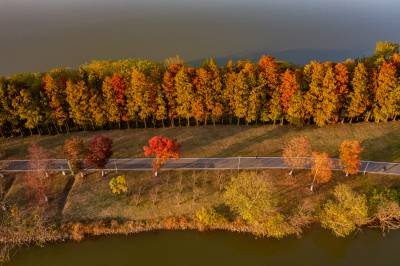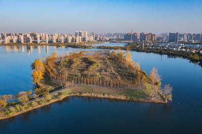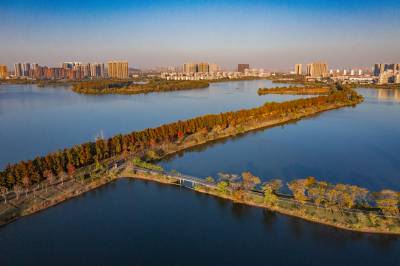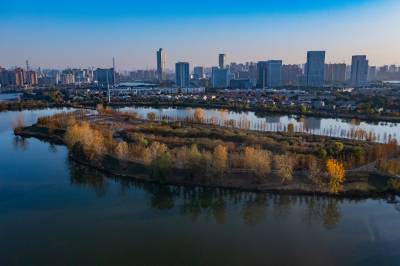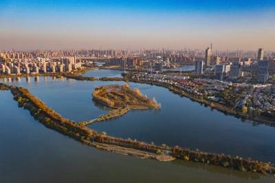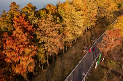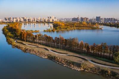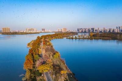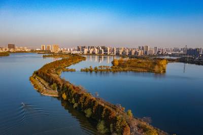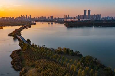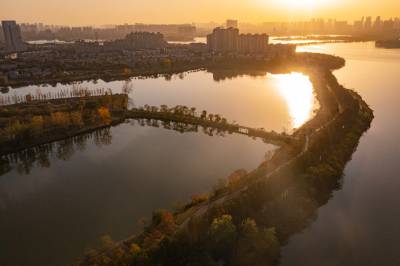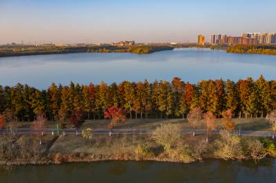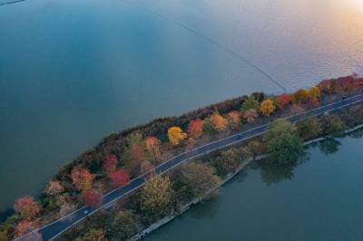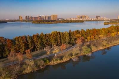 2021年11月23日,傍晚的阳光洒在金银湖绿道上,各色的树叶将绿道浸染,风光无限。连日来武汉天气保持晴朗,空气质量优良,武汉市东西湖区金银湖总长42公里的滨湖湿地绿道,吸引了不少市民前来散步游玩。(湖北日报全媒记者 倪娜 摄)